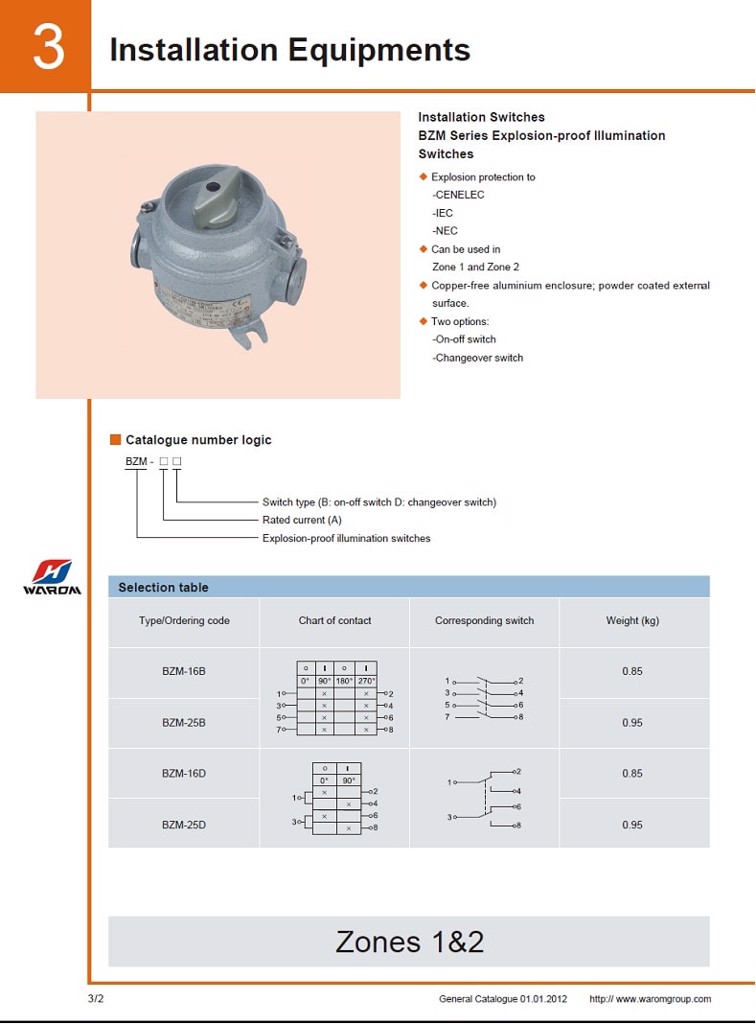 Công tắc chống nổ thường có 2 loại, on/off switch và changer over switch. Công suất 16A-25A. Độ kín của công tắc này vào khoảng IP66, IP67(tùy chọn).